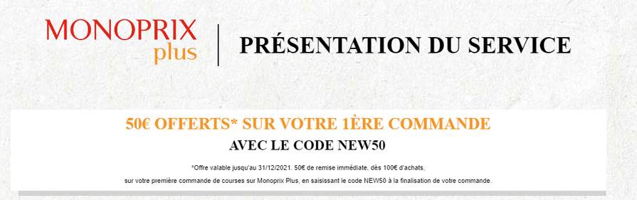 Ces codes donnent 50 euros offerts pour votre première commande d’au moins 100 euros sur Monoprix Plus. Offre valable jusqu’au 31/12/2021. 50€ de remise immédiate, dès 100€ d’achats.