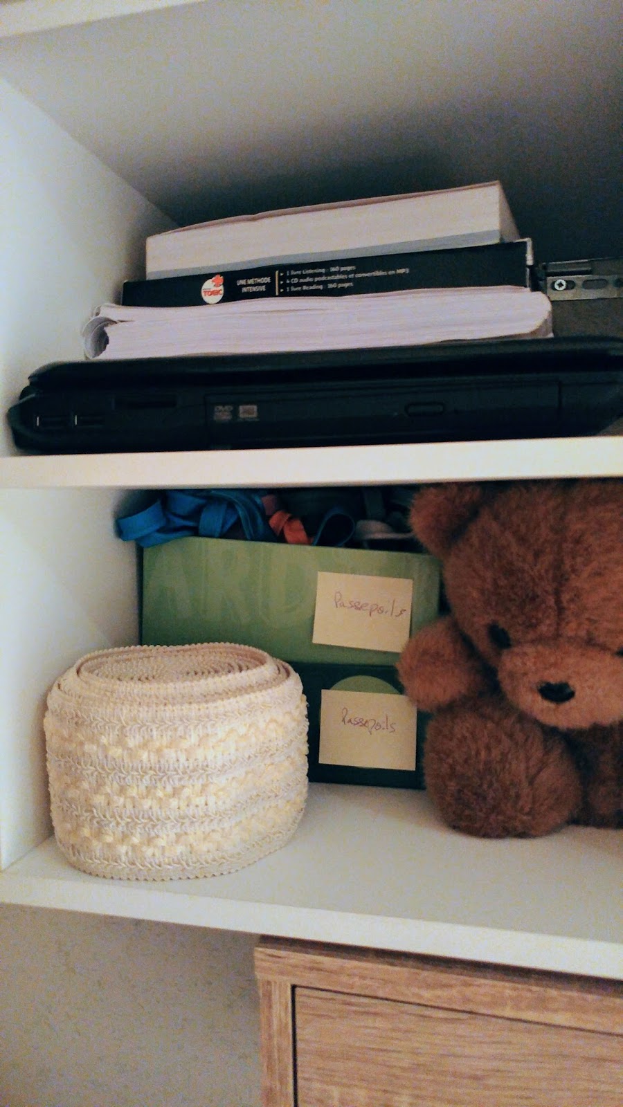 -et la dernière case est en quelque sorte mon coin récup où je vais mettre des rouleaux de papier wc, sopalin ou cadeaux en attendant d’en avoir l’utilité. De même, je stock mes bobines vides gütermann. Je m’en sert pour rouler du simili, des rubans… Oh et j’ai aussi une grande boite de bottes qui est remplie de mes tonnes de pieds de biche (à peu près tous dans leur boite pour m’y retrouver plus facilement).