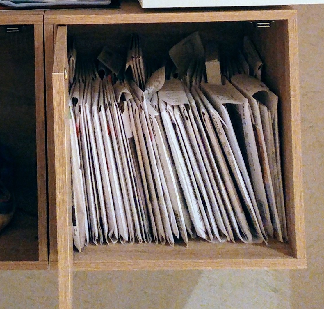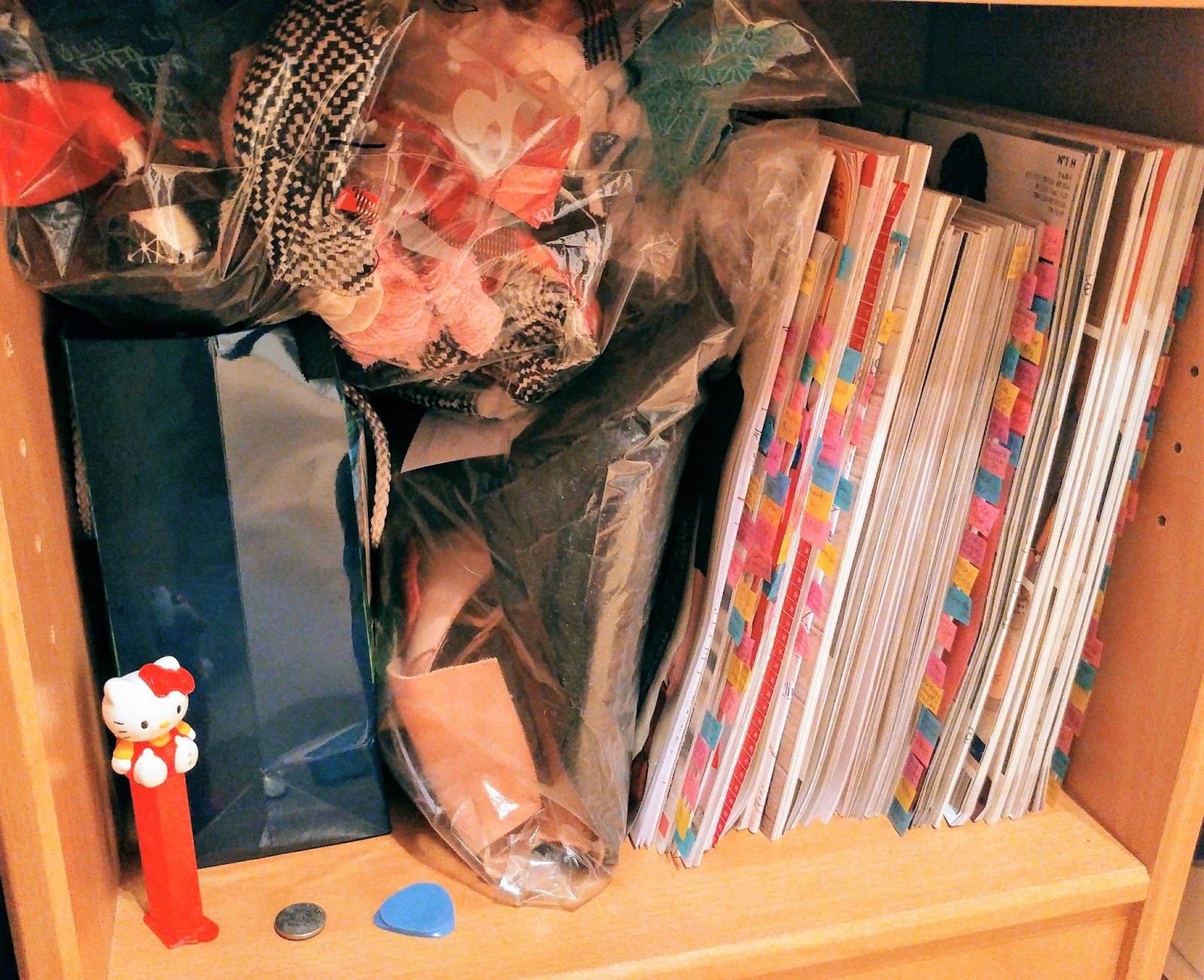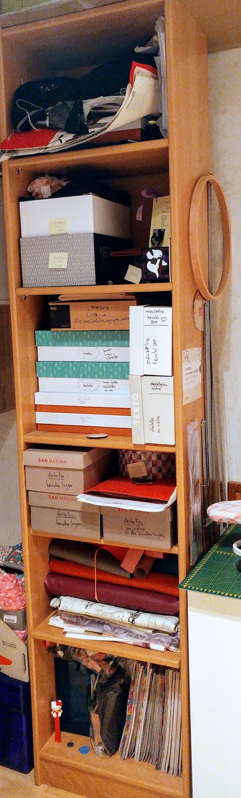 -un étage avec dans des sacs mes plus grandes chutes de tissus et des petites chutes de cuir, Il y aussi tout mes magasines de couture. De temps en temps je prend un des magasines et je le rempli de post-it index indiquant ce qu’il y a et où, comme ça, quand je cherche quelque chose par la suite, je regarde directement les pages qui m’intéressent.