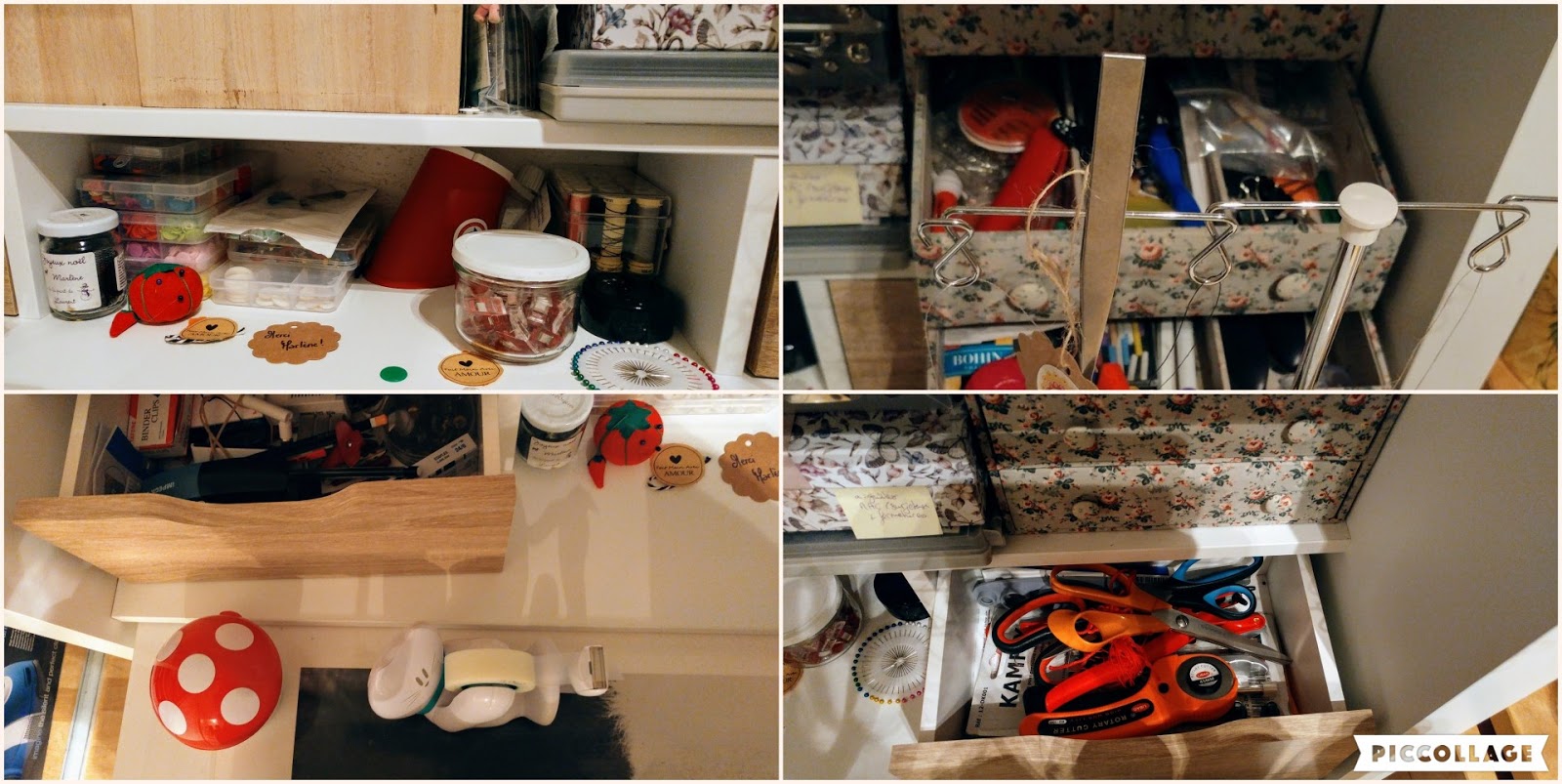 Ce bureau est tout simplement génial, il est assez grand pour que je mette ma surjeteuse et ma machine à coudre dessus, les deux tiroirs sont super pratiques pour mettre dans l’un stylo, agrafeuse etc, et dans l’autre mes ciseaux et cutters. Sous le pont je peux mettre mes boites de rangement de pressions, de pinces, de canettes, de bobines, et il est encore assez profond pour que je mette d’autres choses comme ma pelote d’épingles aimantée, mon scotch (mon meilleur ami quand j’utilise un patron en PDF)…
