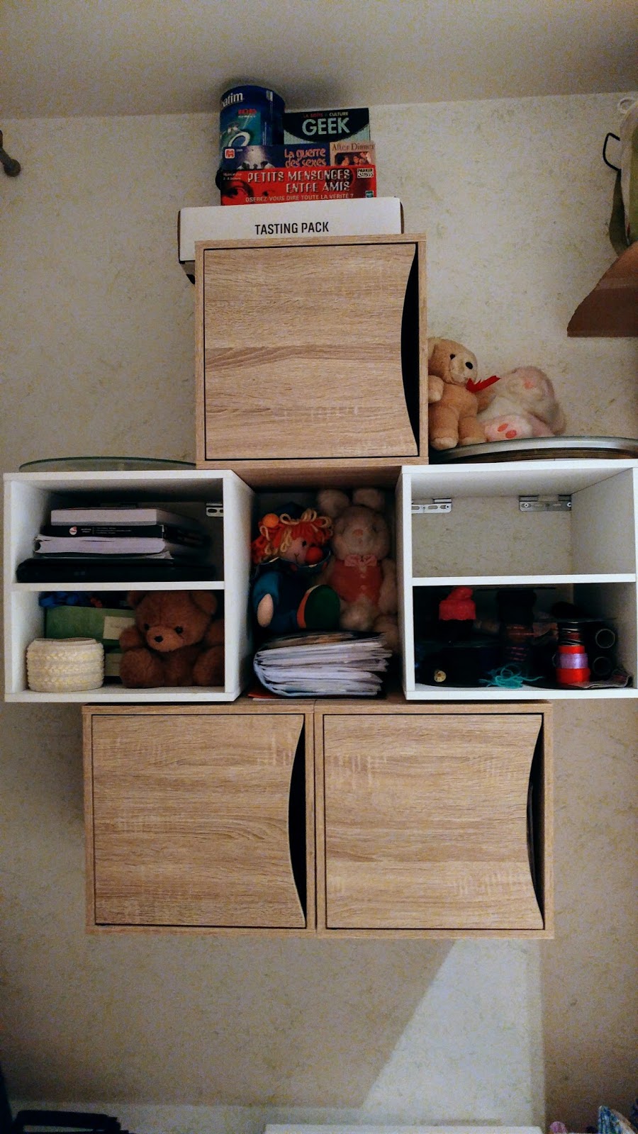 A côté de la bibliothèque, ce sont des cases personnalisables que j’ai acheté chez but et monté / suspendu une à une. Enfin, je les ai suspendu il y a longtemps hein, là j’ai juste rangé vendredi et fini de vider tout ce qui ne concernait pas la couture de la bibliothèque (j’ai expulsé ça tout en haut de la