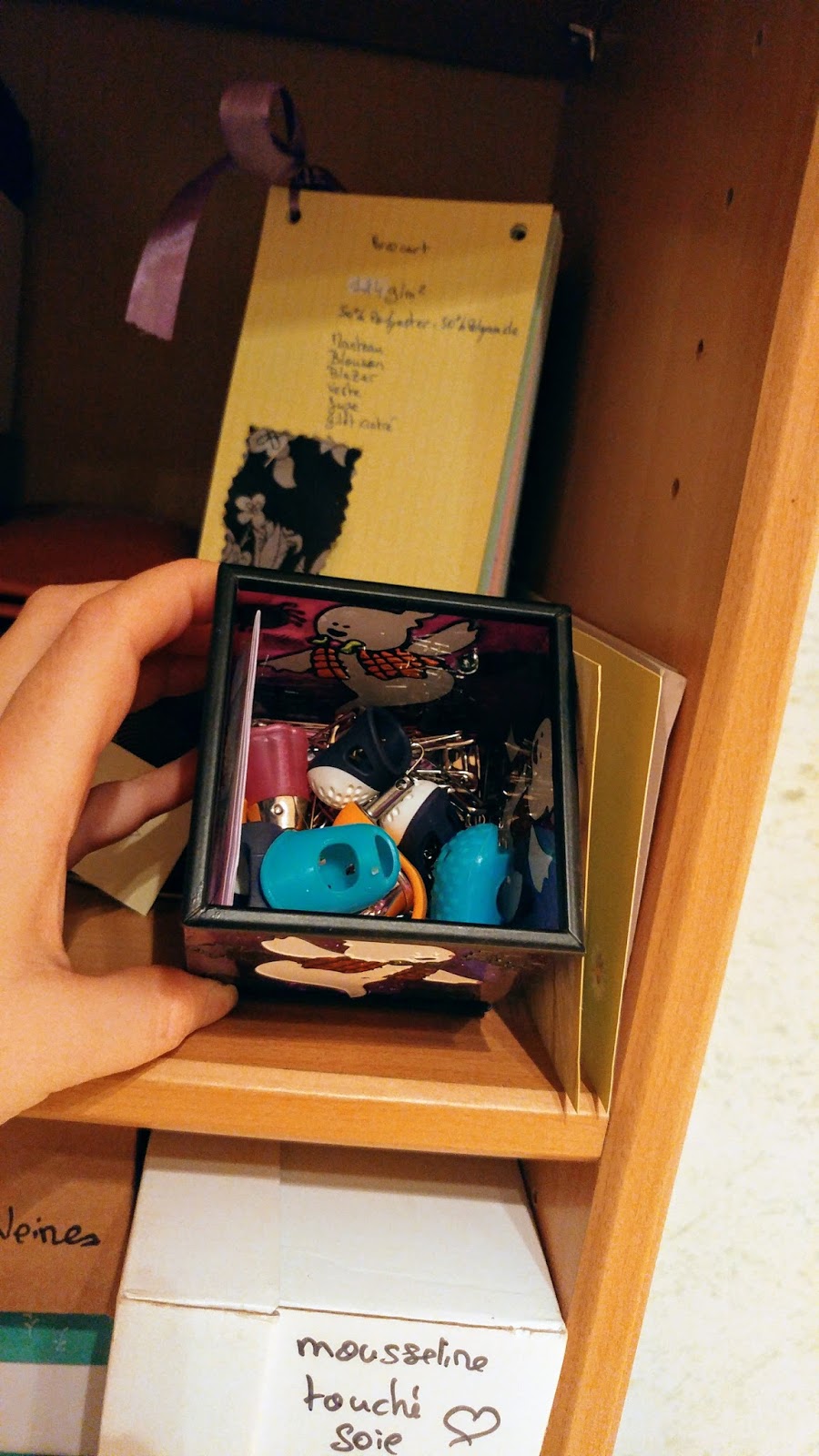 Dans les cases intermédiaires j’ai pu y mettre des boites en bois que j’ai trouvé à Eurodif, j’ai indiqué sur des post it ce qu’il y a dedans pour éviter de les mélanger (l’une est pour mon entoilage tissé déjà ouvert et plié dedans, l’autre pour mes lots de fermetures éclair, et la troisième pour mes tonnes de mercerie pour sacs), ainsi qu’une boite de couture où je met mes aiguilles, craies, découd vite, roulettes à patron, écussons etc. Sur ma surjeteuse je met toujours ma pince (qui sert à passer les fils quand la méthode des noeuds n’est pas suffisante) + l’étiquette en carton christelle beneytout avec l’aiguille que j’ai eu chez elle et qui met permet de rentrer mes chaînettes. Avant de mettre l’aiguille et la pince à cet endroit, je ne les retrouvais jamais, maintenant je les ai aussitôt à disposition. Un zoom sur mes rangements :