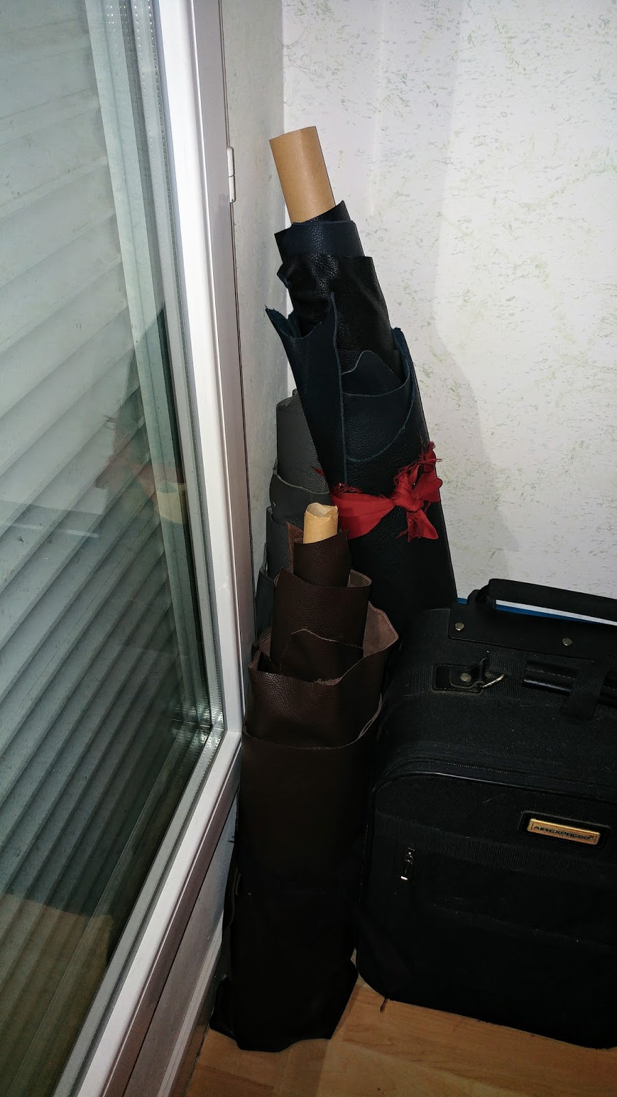 En dessous de ces cases, j’ai des super grandes chutes de cuir, noir / gris / marron (j’avais eu un carton de 10kg à 40€ chez Collaert) que j’ai roulé par couleur autour d’un rouleau de papier cadeau et fermé par un lien (vive les chutes de tissu pour ça).