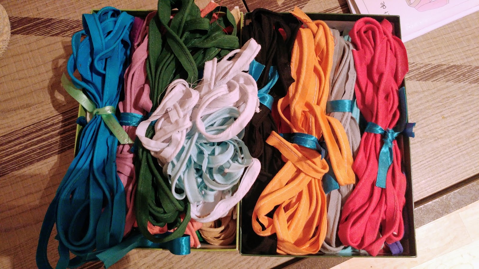 Dans une des cases j’ai mis mes passepoils (ils sont tous en 8 et serré un par un avec un lien et mis dans une boite ouverte en deux et empilée),
