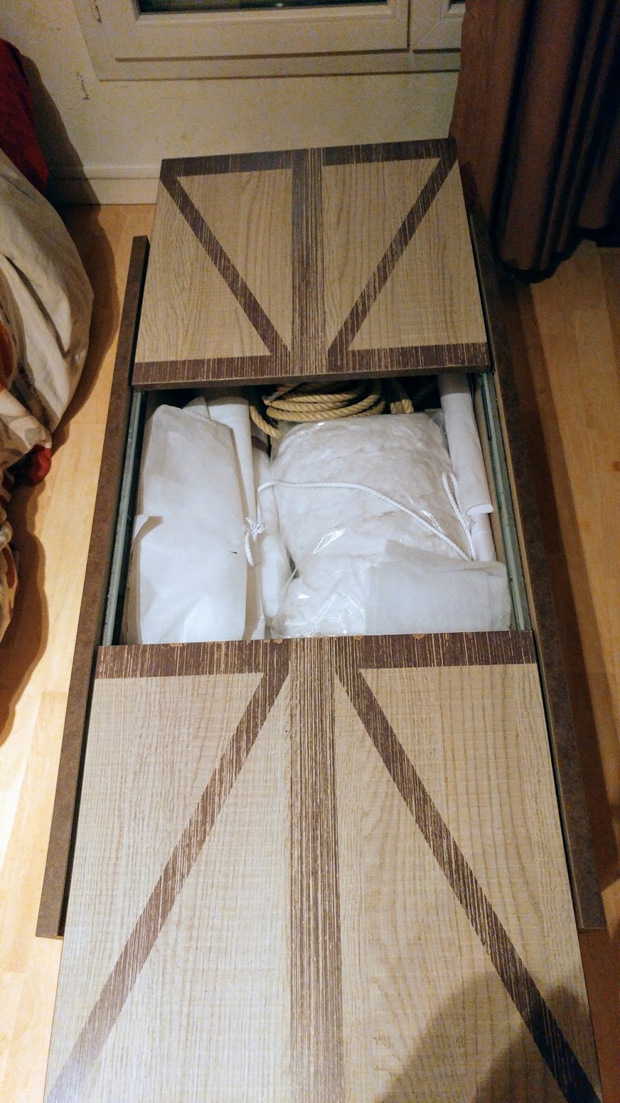 Et résultat j’ai une table basse qui me sert de coffre de rangement très pratique pour des trucs encombrants comme pas deux : ouate, mousse, corde, papier à patron, entoilage thermocollant non tissé etc…