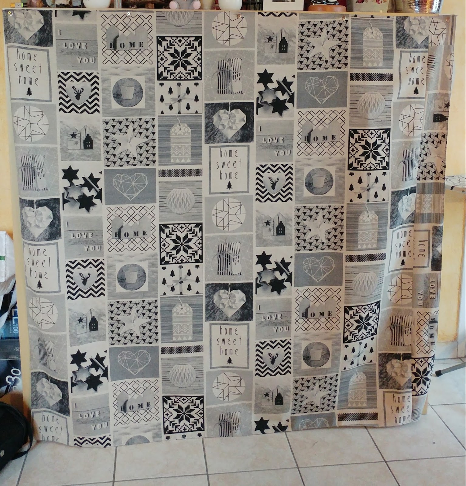 Ma sœur avait craqué sur un plaid sur Pinterest avec des grandes bandes de tissu et un motif central (il était très joli, il me semble que c’était des hiboux sur une branche).